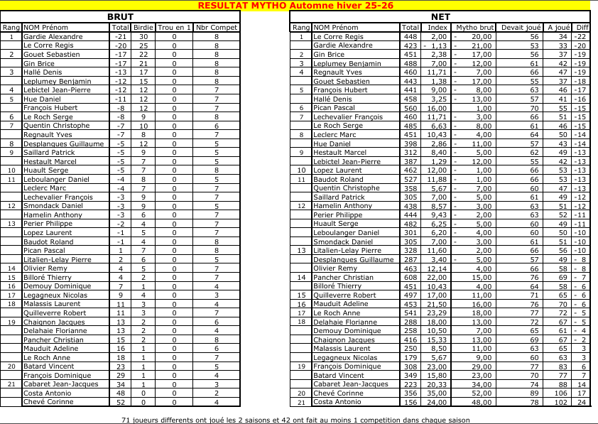 Concernant le Challenge Automne-Hiver, c’est Alexandre Gardie qui remporte le brut avec un cumul de -21 sous le par et Regis Le Corre le net.