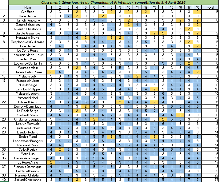 Pour cette 2éme journée du championnat de printemps, c’est Brice Gin avec une très solide carte de -5 sous le par qui remporte l’épreuve du weekend.
